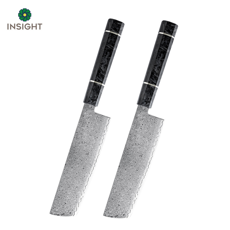 The blade of INSIGHT cleavers is made of 5Cr15Mov stainless steel (not real Damascus) with 56+ hardness.