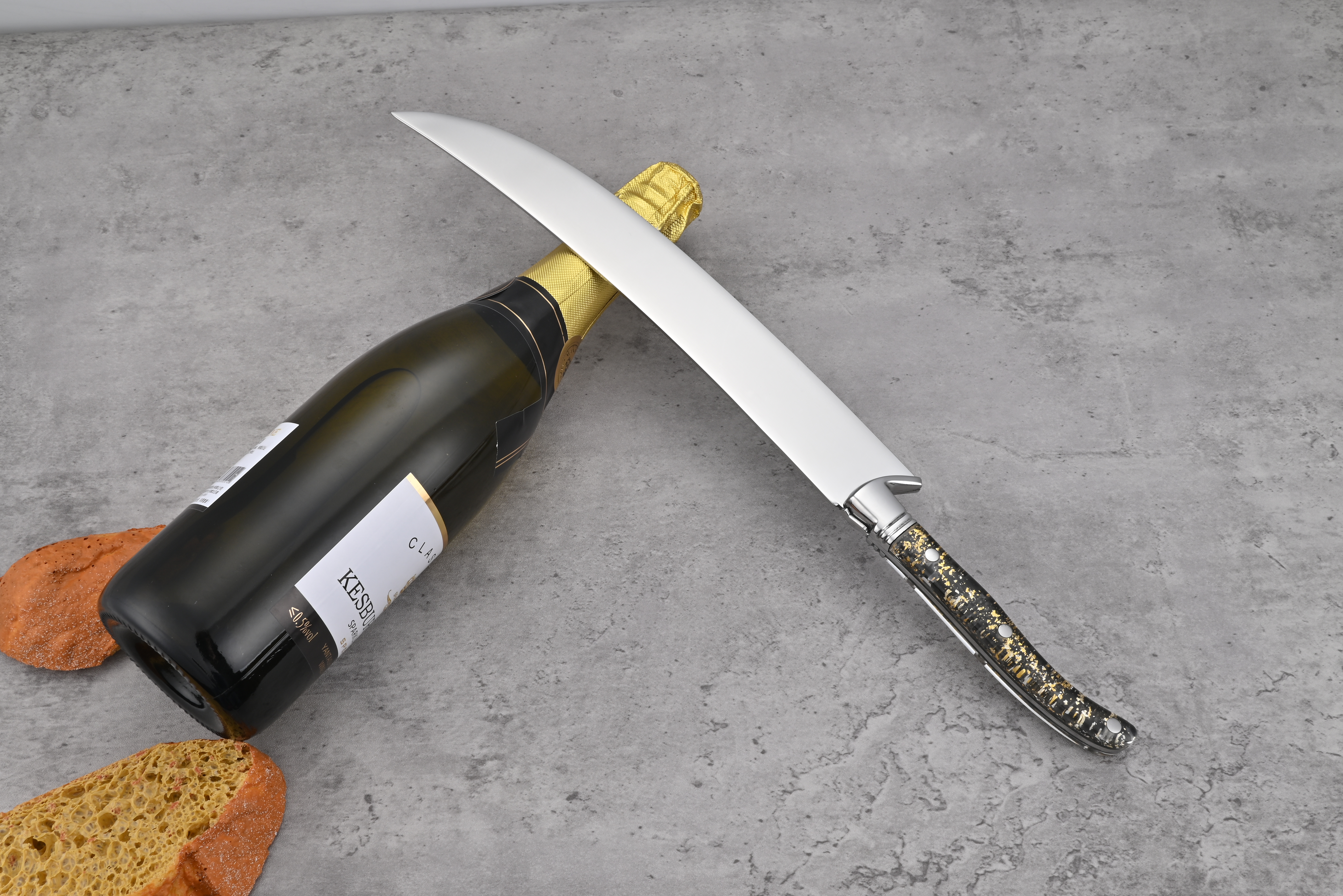 A champagne knife, also known as a sabre or sabre knife, is a specialized tool designed for opening champagne bottles. Unlike traditional corkscrews, a champagne knife is typically a long, straight blade that is used to slice through the neck of the bottle, cleanly removing the cork and the top of the glass.